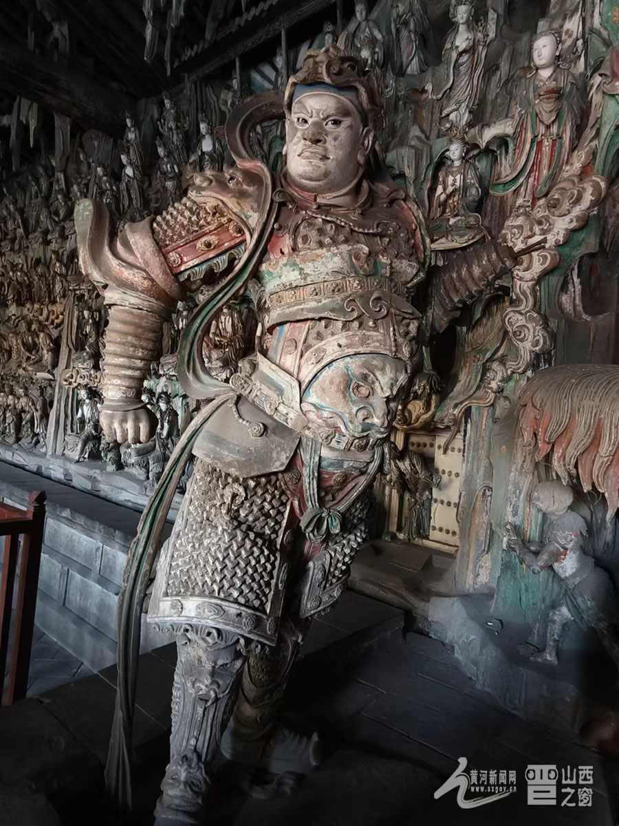 此外,雙林寺內還有許多頗具觀賞價值的彩塑,譬如千佛殿內“自在觀音像”,她以極為放松的姿態(tài)坐臥在蓮臺上,面頰圓潤,微微注視前方,流露出怡然自得之態(tài),武圣殿內的關羽、張飛、趙云等三國人物像,天王殿內的四大天王像,也各具特色,分別代表了不同時代的彩塑風格和文化寓意。據侯麗娟介紹,因為雙林寺是民間寺院,古代工匠在塑像造型和空間利用上具有更大的靈活性,所以雙林寺的塑像才會集古代彩塑之大成,成為今天人們研究彩塑的重要史料。