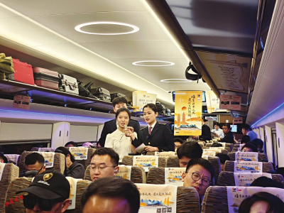 4月22日一早,在太原開往北京的書香列車上,山西晚報(bào)記者看到了這樣一幕。車廂內(nèi),兩側(cè)車窗、行李架、衛(wèi)生間、洗漱臺(tái)等處張貼全民閱讀大會(huì)標(biāo)識(shí),營(yíng)造了濃厚的活動(dòng)氛圍。列車視頻和廣播循環(huán)播放全民閱讀大會(huì)宣傳片,介紹大會(huì)概況及“書香列車”情況。幾名年輕乘客圍在列車餐吧臺(tái)增設(shè)的“讀書角”,選取自己喜歡的讀物。列車工作人員利用流動(dòng)小車,送書到車廂,為旅客提供圖書借閱服務(wù)。在車廂兩端、每個(gè)座位頭枕巾上張貼、印刷全民閱讀大會(huì)主題海報(bào)和“書香列車云閱讀”二維碼,不少旅客掃碼開始免費(fèi)聽書、看書。