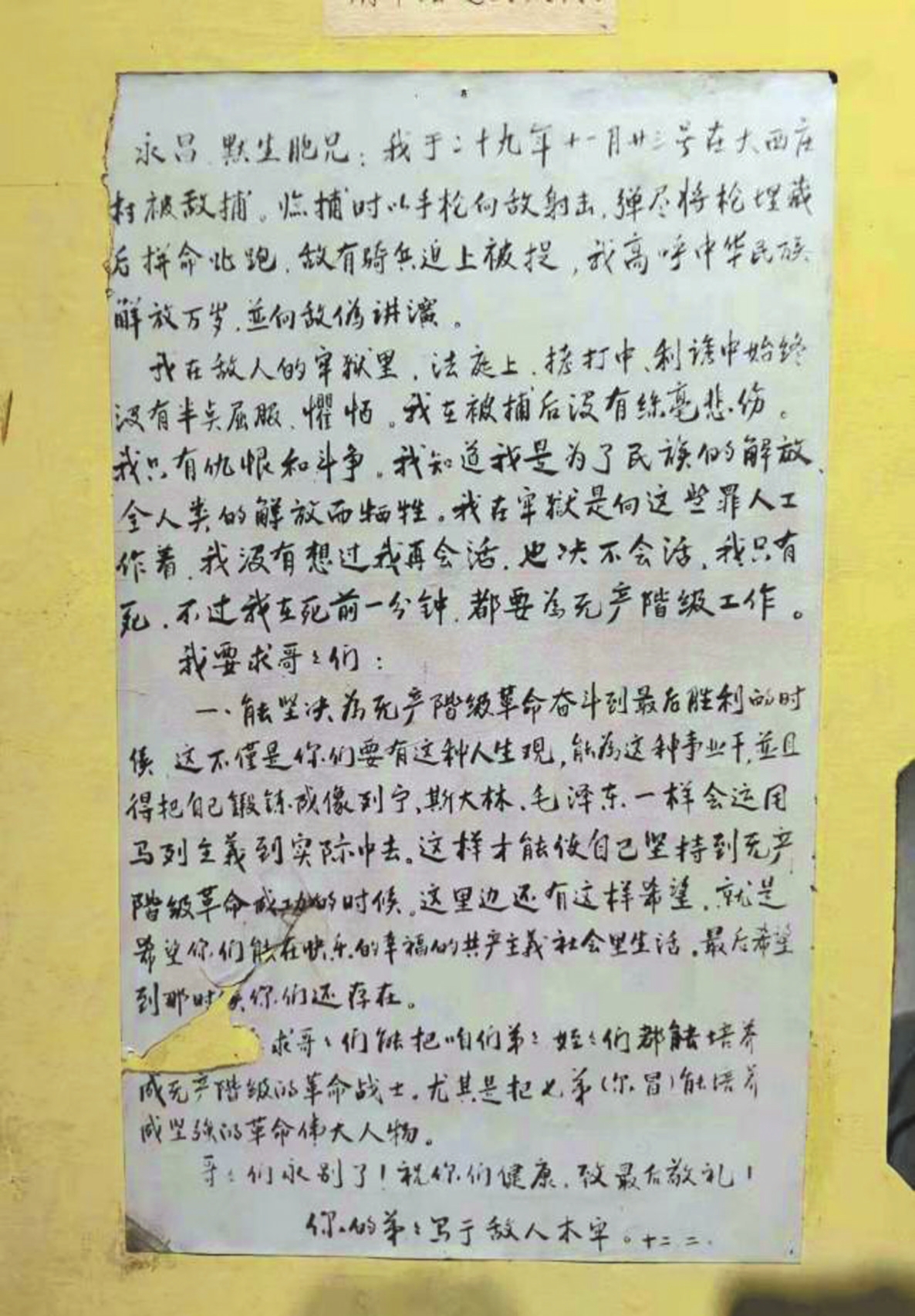 遺書中,表達(dá)了對抗戰(zhàn)勝利的必勝信心;直言“我死了是為國家為民族而犧牲”,以生命詮釋對黨的忠誠,展現(xiàn)了共產(chǎn)黨人堅貞不屈的崇高革命精神與為共產(chǎn)主義奮斗終身的犧牲精神。