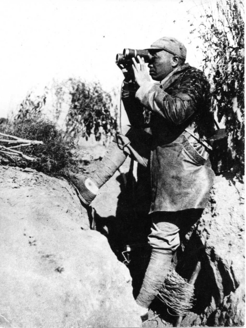 “誰(shuí)敢橫刀立馬,唯我彭大將軍。”照片中,彭德懷大半個(gè)身體露在戰(zhàn)壕外,左腳踏在戰(zhàn)壕底,右腳蹬著戰(zhàn)壕前沿,坐靠在戰(zhàn)壕后沿上,手持望遠(yuǎn)鏡,神情專注地觀察戰(zhàn)況。