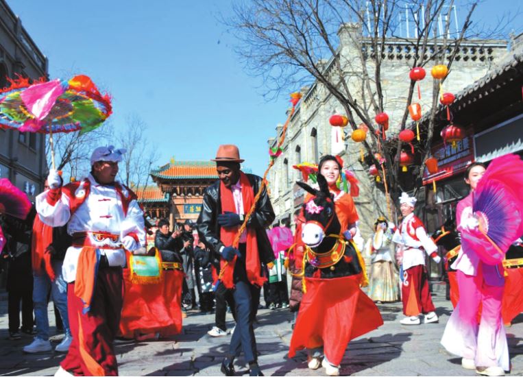 外國友人參與“跑驢”特色民俗表演活動(dòng)。